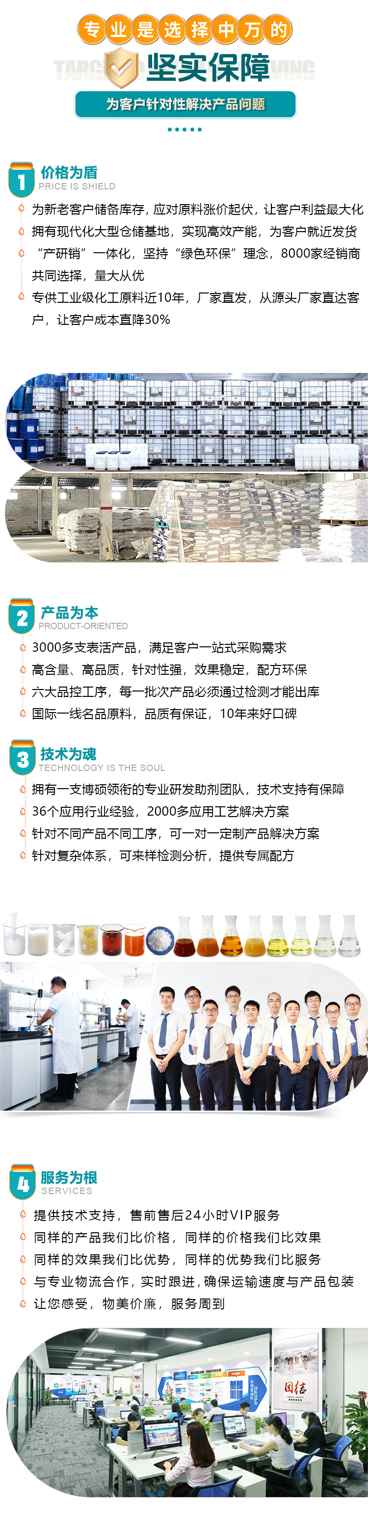 中萬(wàn)一直致力于乳化劑、滲透劑、分散劑等表面助劑應(yīng)用與研究,到目前,本公司主要生產(chǎn)產(chǎn)品有:乳化劑、分散劑、滲透劑、聚乙二醇,聚丙二醇、司盤(pán)、吐溫,聚醚F-6、聚醚多元醇、脂肪醇醚磷酸酯、農(nóng)藥乳化劑、消泡劑等30余個(gè)系列30000多個(gè)品種,廣泛應(yīng)用于紡織、印染、化纖、染料、醫(yī)藥、農(nóng)藥、化肥、橡膠、塑料、造紙、皮革、日化、涂料、金屬加工、混凝土等領(lǐng)域。中萬(wàn)始終堅(jiān)持"質(zhì)量至上,服務(wù)客戶(hù)"的原則,堅(jiān)持以創(chuàng)新產(chǎn)品、完善服務(wù)為經(jīng)營(yíng)宗旨,腳踏實(shí)地,恒久堅(jiān)持,以市場(chǎng)為導(dǎo)向,成為行業(yè)界助劑模范。