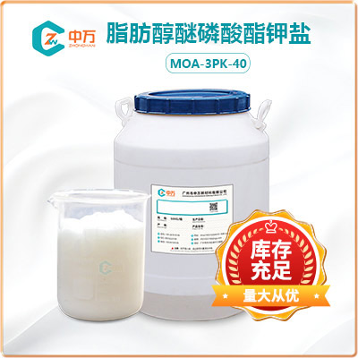 脂肪醇醚磷酸酯鉀鹽MOA-3PK-40具有抗靜電性、平滑性、潤濕性,緩蝕性,用作合成纖維加工中改善可紡性能的原料;也有吸濕性,在低溫時仍具有良好的抗靜電性,廣泛用于化纖油劑中作抗靜電劑;還有良好的去污性,用于配制高效無毒洗凈劑。